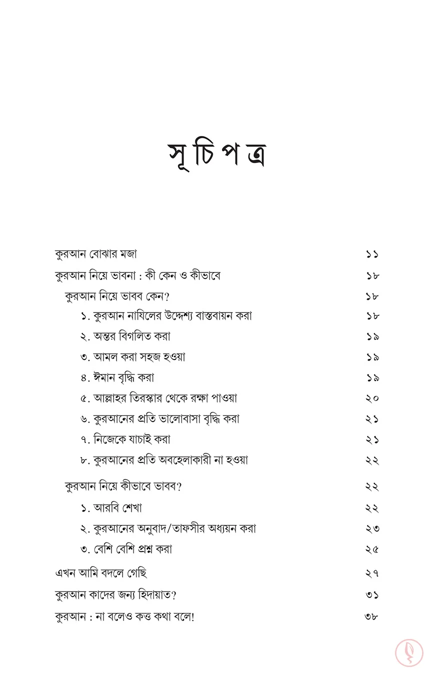 কুরআন শুধু পাঠ করার জন্য নয়, তা বোঝার এবং জীবনে বাস্তবায়নের জন্য। এই বইটিতে লেখক দেখিয়েছেন কুরআনের আয়াতগুলো নিয়ে কীভাবে চিন্তা-ভাবনা করা যায়, এবং সেই ভাবনা কীভাবে আমাদের অন্তরের দরজা খুলে দেয়।